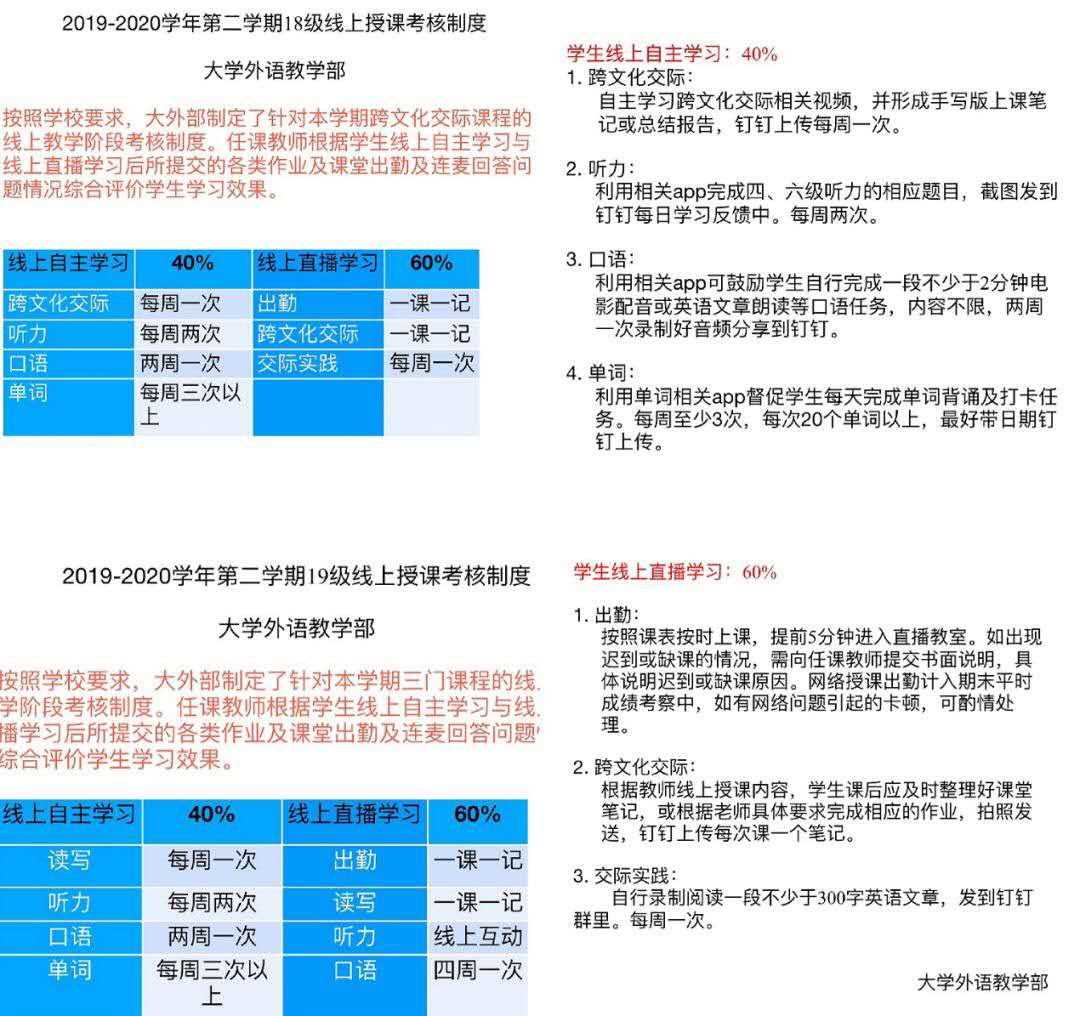 根据我校下发的关于《延期开学教学工作安排》文件要求和教务处的相关教学工作安排,结合大外部 2020 年春季学习承担的六门课程教学内容,精心挑选授课平台、网络授课期间的教师和学生的考核形式和参考指标,筹备安排了各门课程上教学实施方案,包括技术支持负责人,教学内容布置负责人等事宜。实现开学延期课不停,教学质量有保障的目标。形成了《大学外语教学部2019-2020 学年第二学期线上教学指导方案》和《大学外语教学部 2019-2020 学年第二学期线上教学考核标准》。要求每位任课教师按照文件要求完成线上直播测试,备课时做到一课一案,一生一案,确保授课质量,各项方案的制定是为教师提供更好的教学设计参考,帮助教师引导学生精准学习,切实解决教师在线教学所需。
